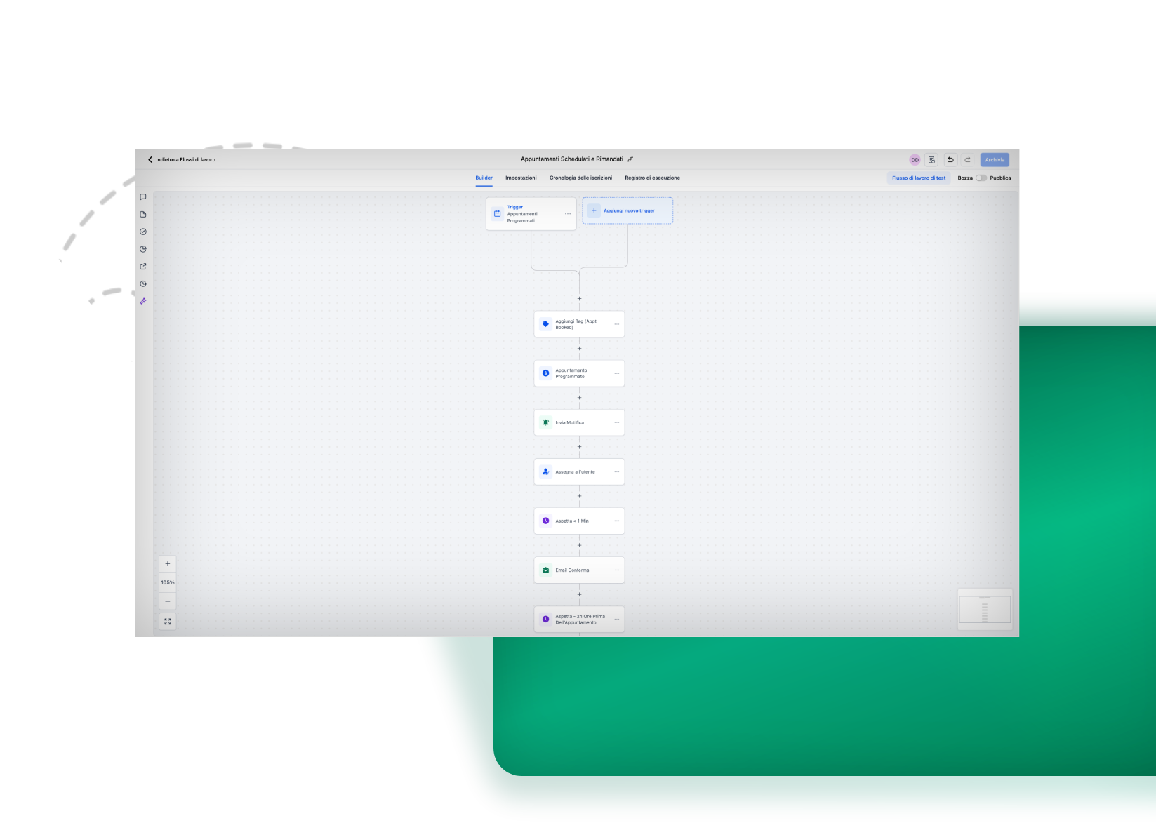 Invia promemoria per gli appuntamenti, ottieni più recensioni positive su Google e altro ancora. Il nostro generatore di flussi di lavoro elimina tutte le noiose attività manuali. Ti toglie il peso del lavoro dalle spalle.